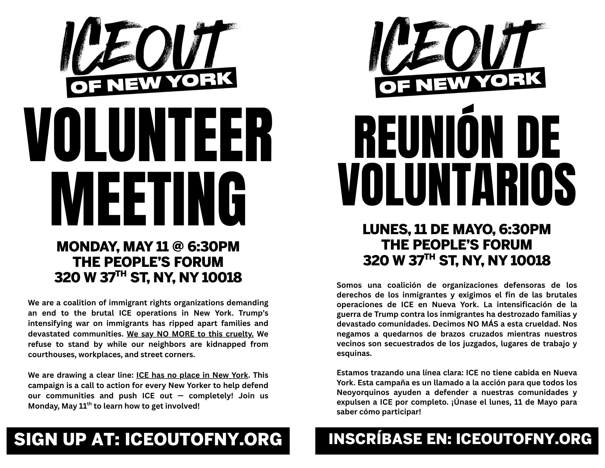 We are a coalition of immigrant rights organizations demanding an end to the brutal ICE operations in NY. Trump’s intensifying war on immigrants has ripped apart families and devastated communities. We say NO MORE to this cruelty. We refuse to stand by while our neighbors are kidnapped from courthouses, workplaces, and street corners.
